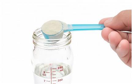 使用奶粉罐内的奶粉勺,按照冲调比例,精确量取奶粉倒入奶瓶中。