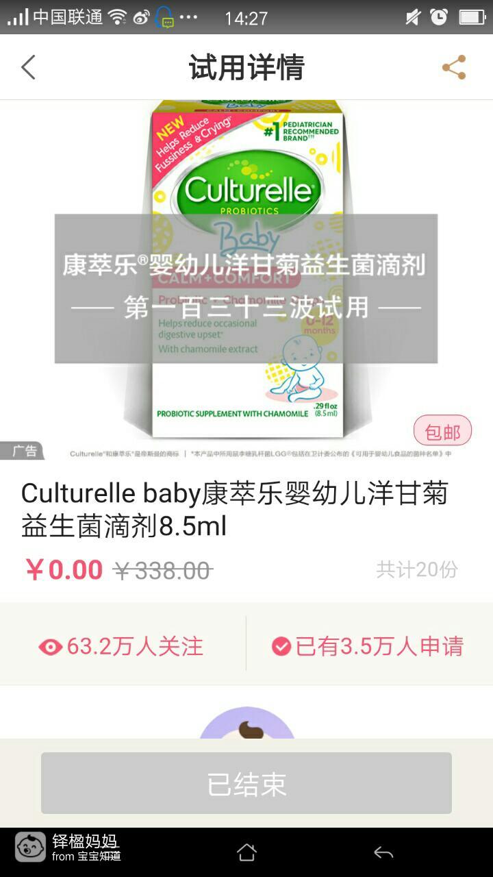 这次试用有63.2万人关注,有3.5万人申请,只有20份,我竟然中了,真是非常幸运。如果你想得到宝宝知道的试用机会,就请关注一下宝宝知道的福利社,点我,然后就看到福利社了,点进去,每次都有不同的试用产品,认真填写申请理由,总会中奖的,都是免费的吆!收到货物记得填写试用报告,祝大家都有这样的好运气。加油!
