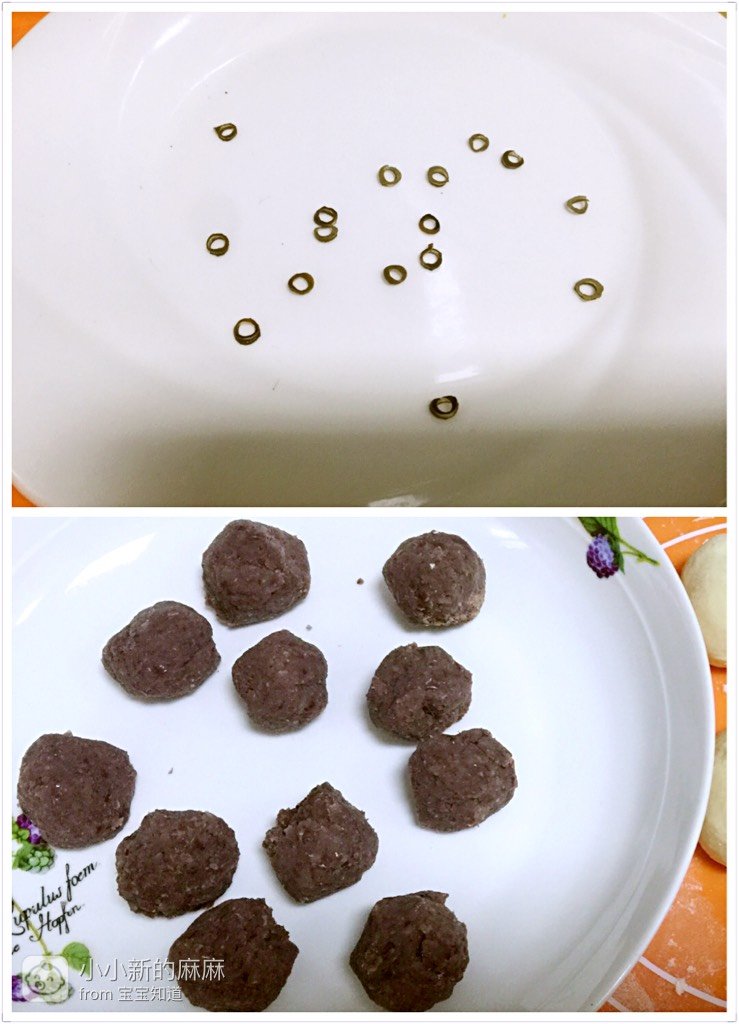 面粉发酵的同时,将提前泡好的木耳用粗吸管、细吸管按出空心圆片(制作眼睛)堡悠劳。豆沙揉成小圆球