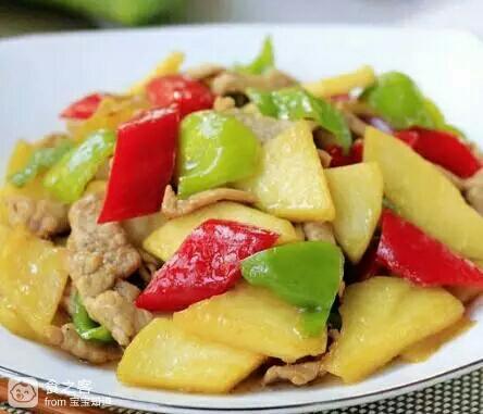 2.热锅凉油油热7成下肉片翻炒变色捞起,锅底留底油,加姜末、青红辣椒翻炒出香味;加青芒果翻炒均匀,加肉片、盐、酱油翻炒均匀,加鸡精翻炒均匀即可。