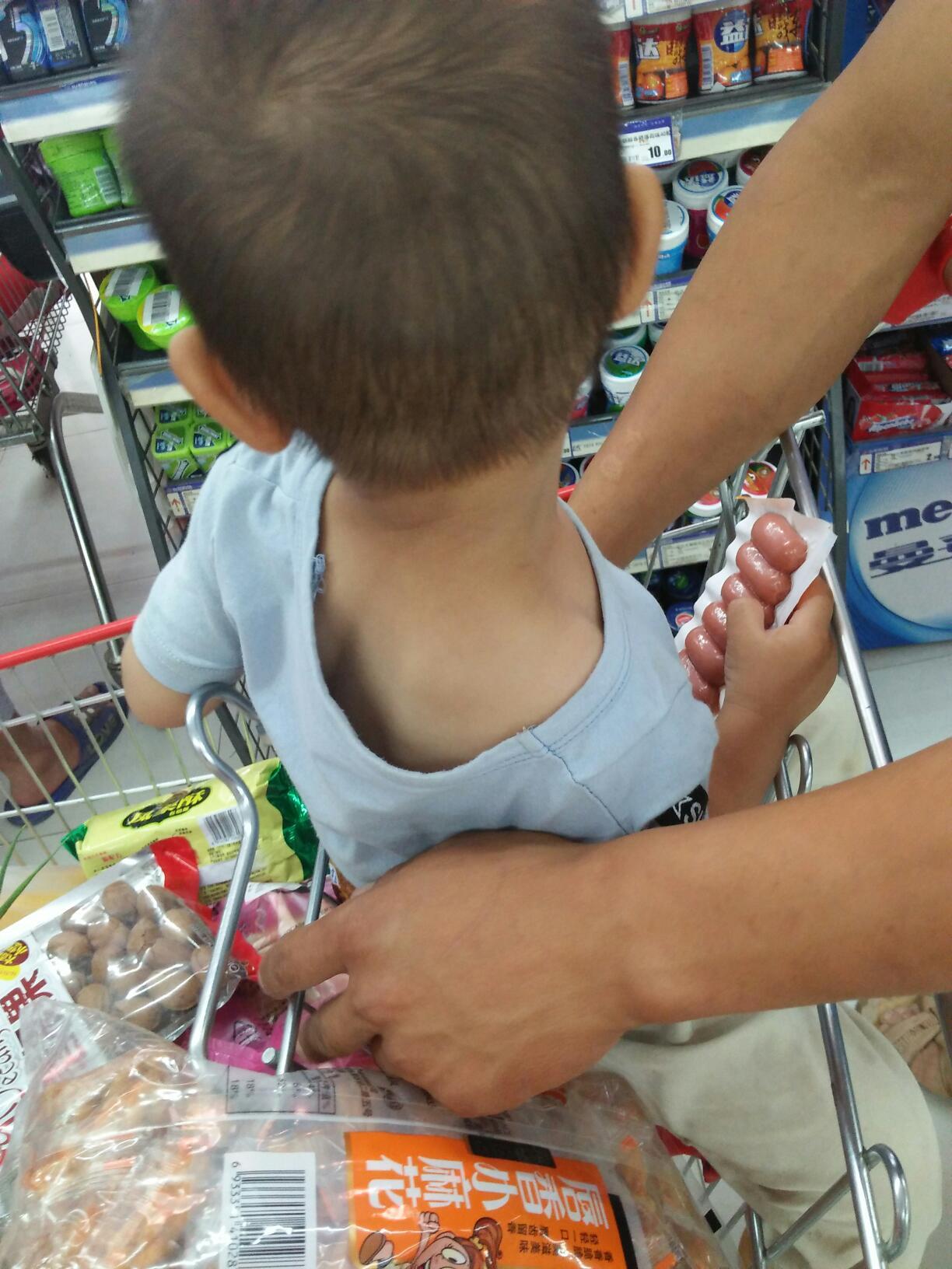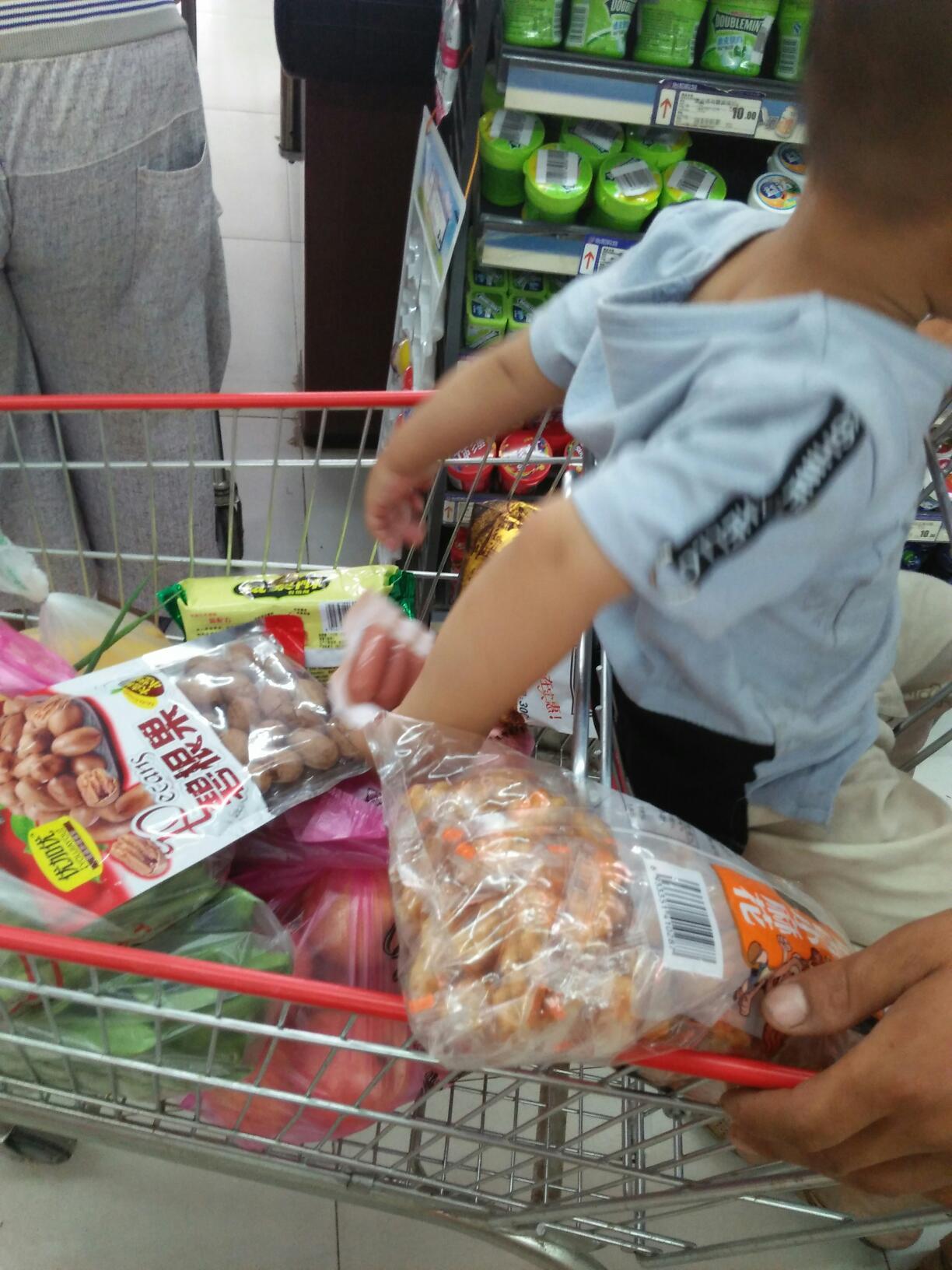 在超市里逛了差不多半个小时,他握着火腿肠一点都没有松懈,在排队等着结账的时候,我逗他要他手上的火腿肠,结果人家直接把手藏在了背后,剑慕嘴里还清楚的说着,没有,那软糯的声音,配上耍精时神气的表情,真的特别的好笑。