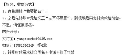 2,之后先转账10元给义工“左耳环豆豆”,到现场后再支付余玻以串款给前台。 如果因个人原因报名了没去的10元不退,请谨慎报名。