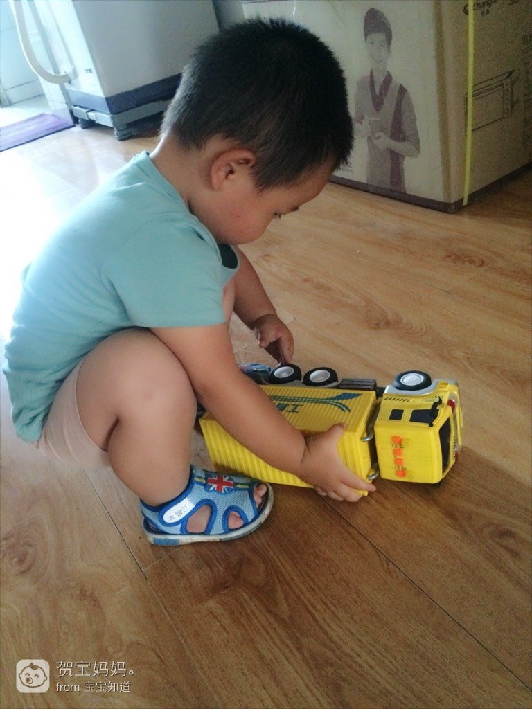 回到家里宝贝就迫不及待地让拆开,玩弄起来。姥爷告诉宝宝:这是一个工程车,有一个大货箱,可以放很多东西呢,说着,给宝贝打开货车的门看。