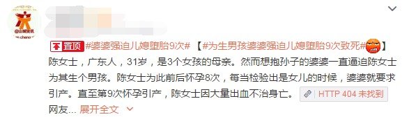 前段时间有篇新闻在社会中引起了很大的震动。一位3个女孩的母亲,为生男孩,婆婆强迫她堕胎9次,最终因大出血不治身亡。