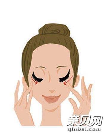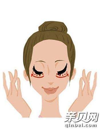 Step1:先取适量眼霜在无名指,根据眼霜的质地来控制分量。轻轻匀开后用无名指按照箭头方向轻点在眼睛周围的皮肤上,注意每个点的位置眼霜的分量要尽量平均,眼角等重点位置更不可遗漏。