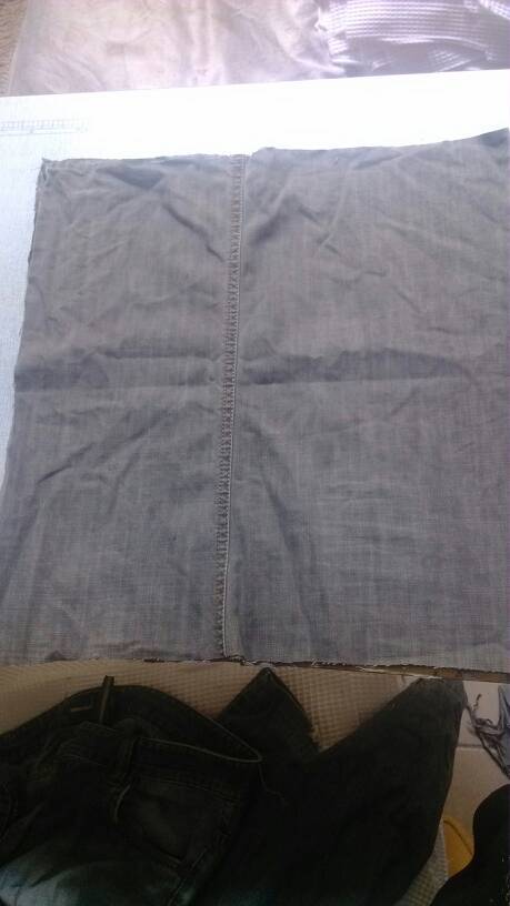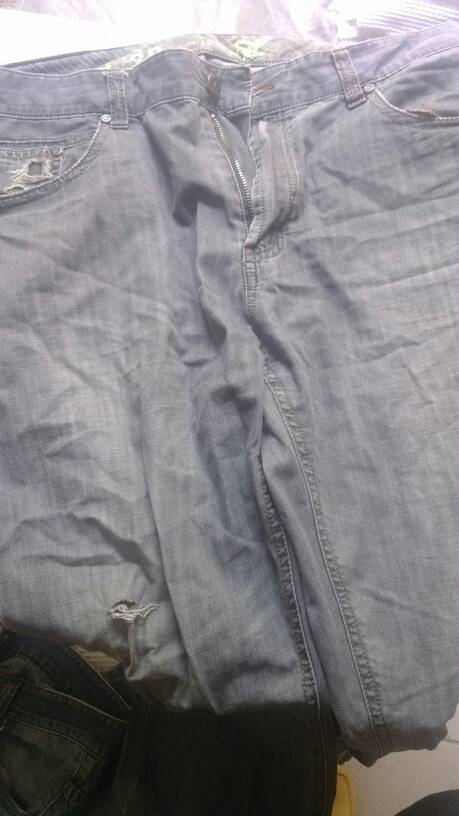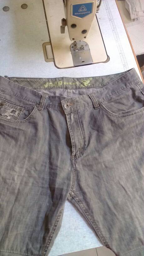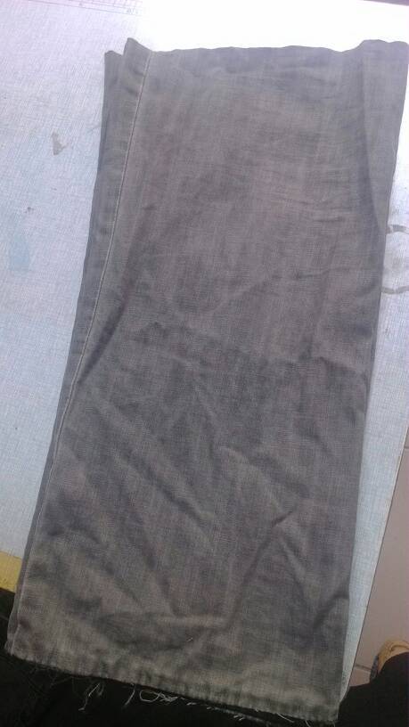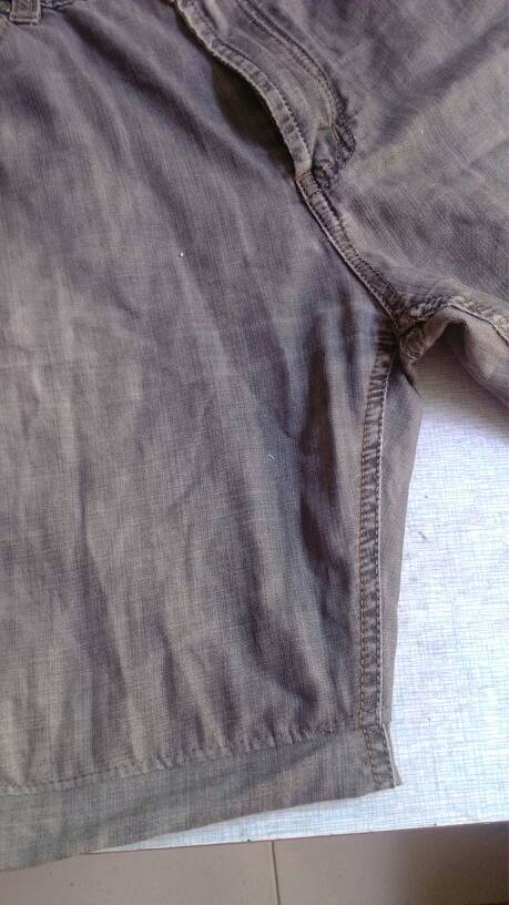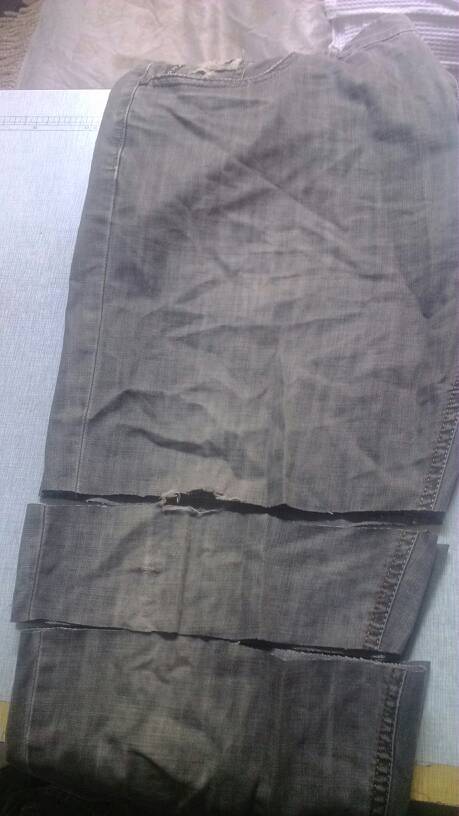 把膝盖破损处剪开,裤腿还很长再剪下一小段做短裤的裤边