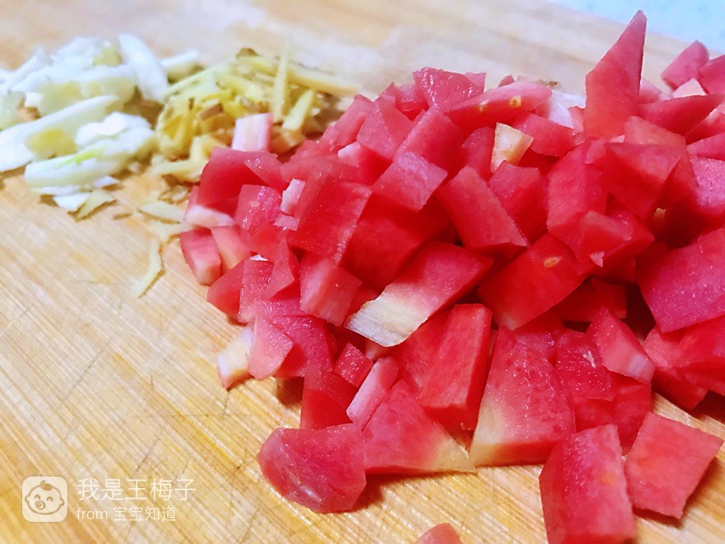 2、红豆提前浸泡4小时以上,胡萝卜切成一厘米见方小块,小葱切成葱花,根部和叶子分开放置,生姜切成丝儿,大蒜切小。