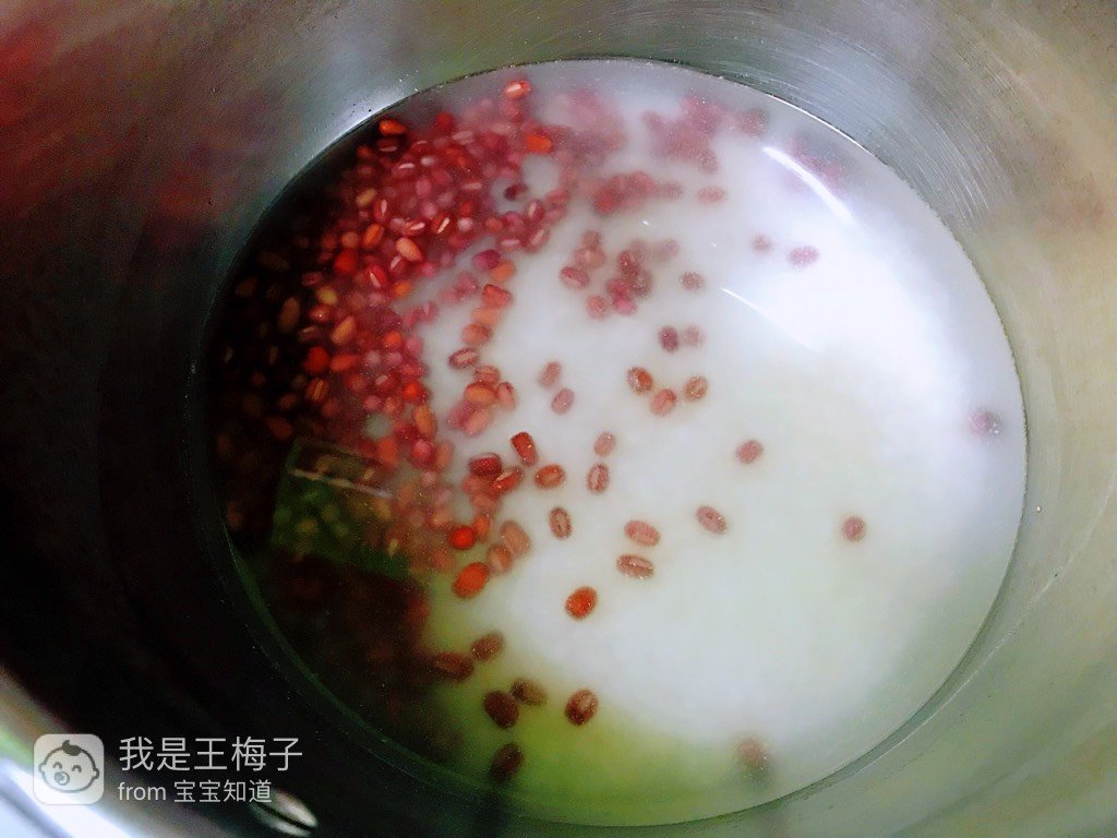 5、清洗干净的大米和红豆放在高压锅里,加入水没过大米半个手指头,要比平时蒸米饭的水少一些,刚才做好缘惑的鸡肉里面有水分也得算进去。