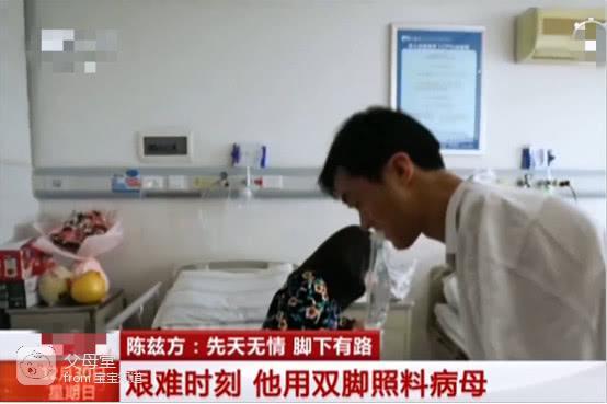 后来母亲突发脑梗,陈兹方没有选择请护工,而是自己亲力亲为照顾母亲。用脚给母亲洗漱、喂饭喂药,还用脚给母亲换药。虽然很艰辛,但是他毫无怨言。