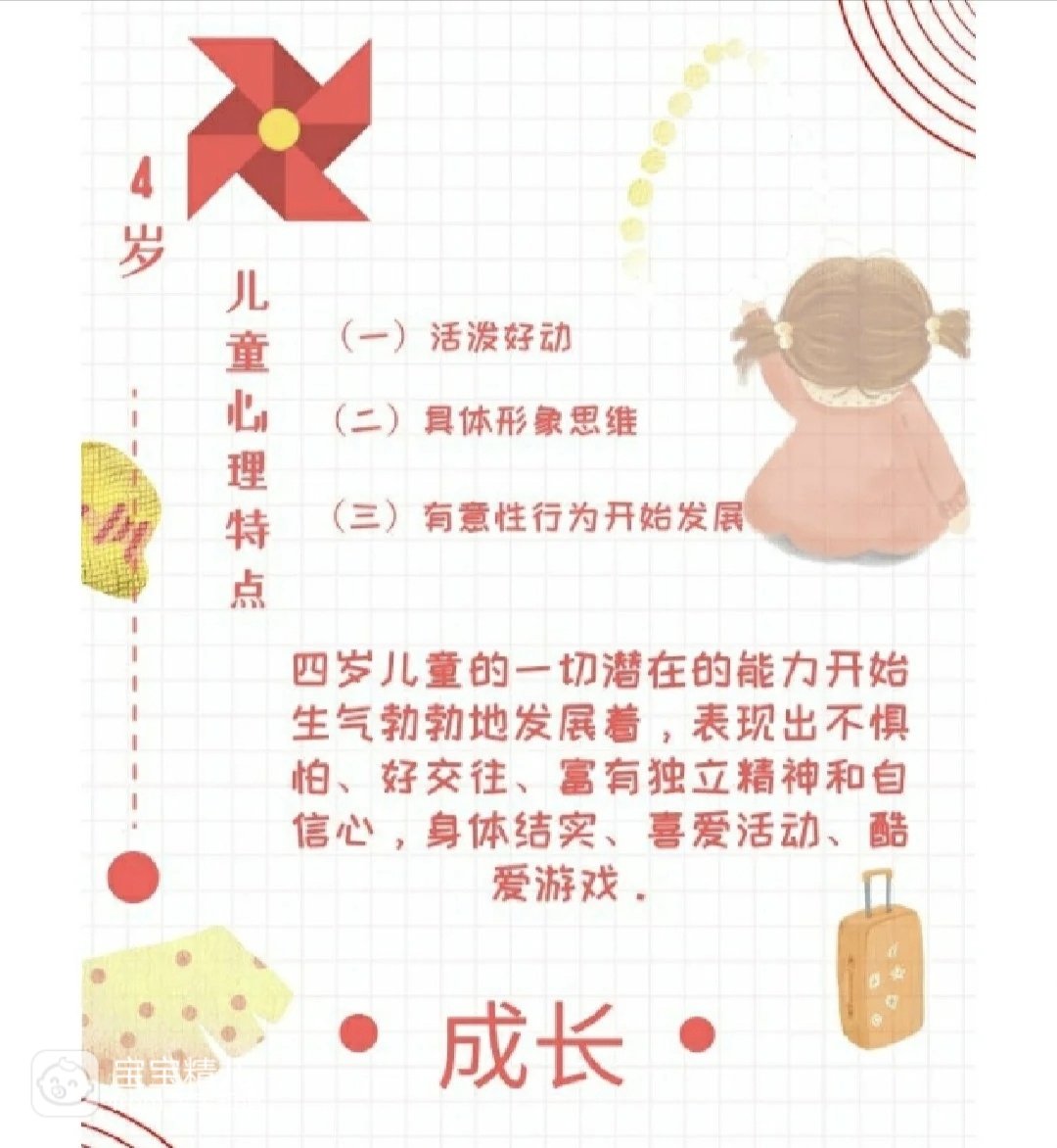 四岁儿童的一切潜在的能力开始生气勃勃地发展着,表现出不键肆惧怕、好交往、富有独立精神和自信心,身体结实、喜爱活动、酷爱游戏。