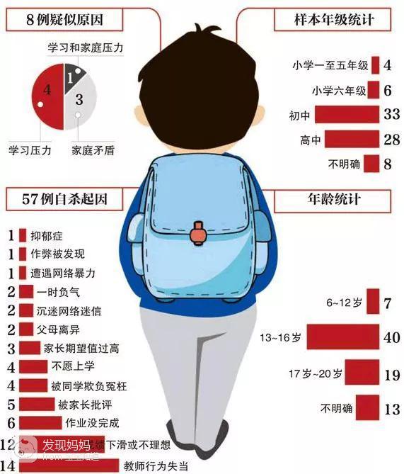 从统计中我们可以发现,13~16岁的中学生自杀率最高,主要原因为:学校(教师和同学的不当行为),学业(压力大,成绩下降),家长(期望值过高,家庭不和睦)。