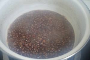 红小豆里加入高过红豆一指的水,煮沸,关小火,煮到红豆熟软。水不够了可以稍微加点,不糊锅就行了。彻底软烂了才能加糖喔!提前加了糖,豆子就煮不烂啦!