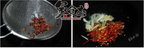 4. 余油再次加热,下姜蒜红辣椒丝煸香
