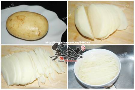 红辣椒丝炒土豆片的做法 1. 土豆去皮先切薄片,再改成细丝,切好后先用清水冲洗两次再整个浸在水里,待准备下锅时再捞出沥干水份