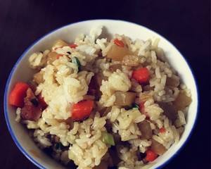 小贴士 煮饭是水可以比平时少放一点,这样煮出来的菜果饭会更好吃。