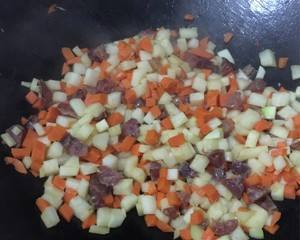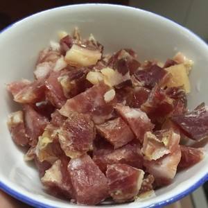 把腊肠和腊肉也切成粒,喜欢吃腊肠的朋友可以多放点腊肠,少放点腊肉。