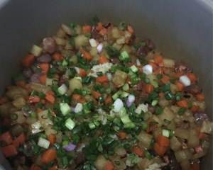 把材料倒进刚煮好的饭里面,再按开关煮10-15分钟,加上香菜和葱就可以上碗。如果不够咸的可以稍微加一点酱油。