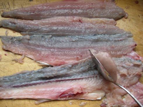 3. 将鱼去头、剔出刺、洗净后,用左手按住鱼的尾部,右手拿不锈钢的小勺,由鱼尾向鱼头方向剐鱼肉,剐到仅剩鱼皮。(鱼皮不要)