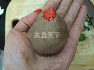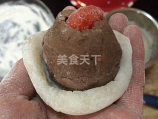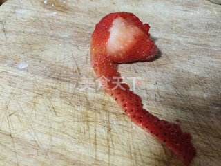 6 在草莓外面包一层红豆沙,露出草莓的尖尖的头(为了切面好看)