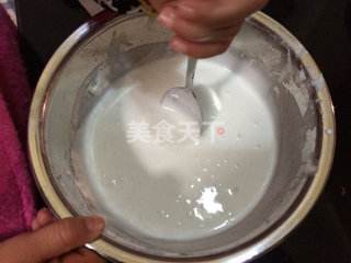 2 糯米粉、澄粉过筛,加入水、油拌成无颗粒