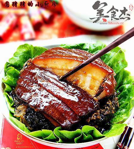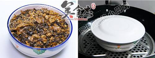 11. 再将炒玻辨香的梅干菜,铺上表面。并用汤匙压紧实