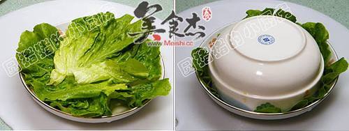 13. 放入数片生菜在盘中垫底。也可将另种蔬菜,烫熟摆盘垫底