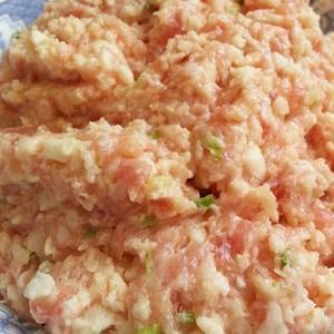 用料 undefined 将肉糜和切粒的马蹄混合在一起,加入调料和鸡蛋、面粉,搅拌上劲
