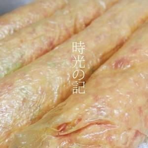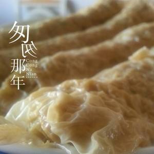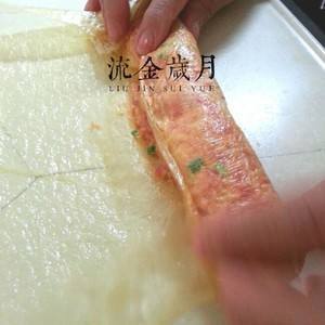取豆腐衣一张,放上适量搅拌上劲好的肉糜,卷化险成条状