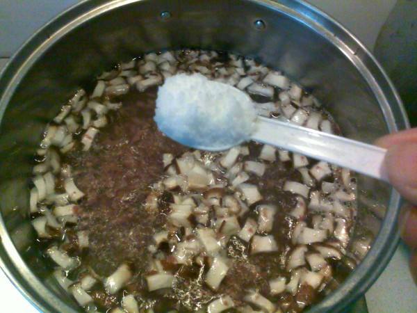8. 在锅里放盐、胡椒粉、十三香,调好味。