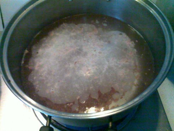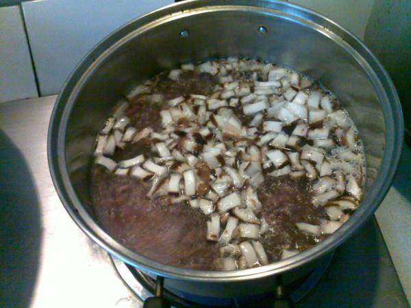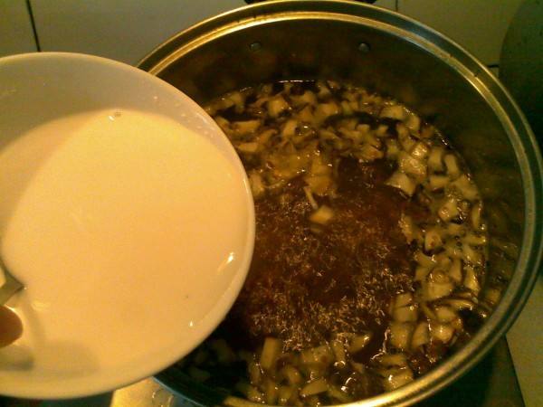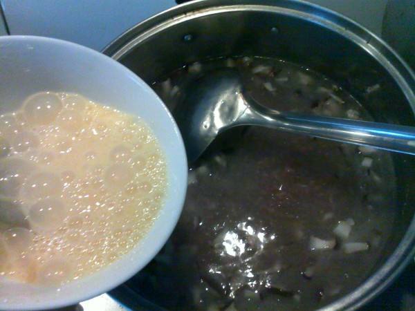 10. 水烧开后,倒入水淀粉,不停搅拌,以防结团,
