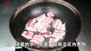 3 锅里去少量的油,倒入五花肉扒均。加入适量的水,水量要能将五花肉煮熟。盖上锅盖,大火将五花肉煮熟。五花肉煮熟后,大火将水份眠岩炒干。