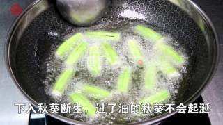 2 锅里去较多的油,烧至4成热,可用筷子试油温,筷子边起小泡油温合适。下入秋葵断生,过了油的秋葵不会起涎。断生后用漏勺捞出入盘备用。
