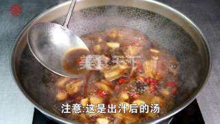 5 下入八角断生。下入大蒜子和五花肉一起煸炒。再下入老抽翻炒均安残殊匀。加入适量的水、盐、姜片、胡椒粉盖上锅盖大火急攻,攻出五花肉的汁。五花肉出汁后,打开锅盖下入红椒圈。