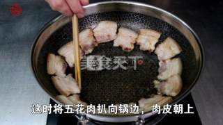 4 水份炒干后转小火煎出五花肉的油份。转动锅子小火慢团崭煎,这样煎出来的五花肉才香。煎香一面后翻面,继续转动锅子小火慢煎,煎出油份。煎出的油多了以后,猪皮会爆小心伤人。这时将五花肉扒向锅边,肉皮朝上。转中火继续煎出油份。