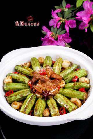 1 小五花肉适量,切成厚片;小红椒适量,切成辣椒圈;大蒜子适量,八角1个;秋葵适量,切头去蒂,切成一样长短。