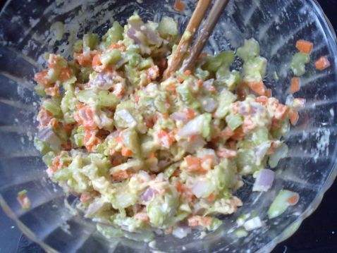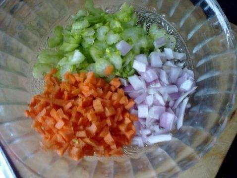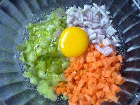 三丁鸡蛋饼的做法 1. 圆葱、芹菜、胡萝卜切丁备用。