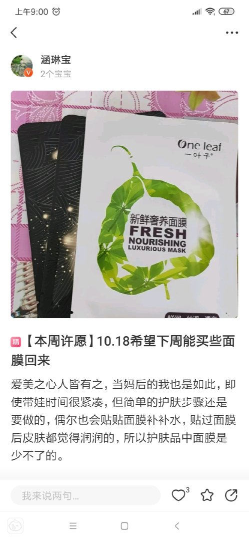 孩子小的时候没有时间捣鼓自己,随着两个孩子渐渐长大,也能抽出时间来美美的护肤了。这不,面膜是女生少不了的,贴个面膜之后皮肤都感觉水润润的,虽然贴的次数不多,但是偶尔还会贴一下子。