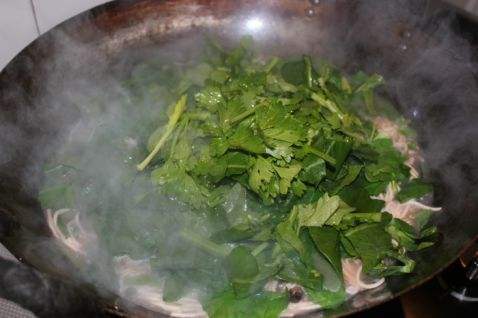 13. 待面条摊开后 再把那些菜叶子加进去 搅拌好即可