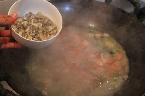 11. 水开后先把海蛎加进去 再放入该放得调味