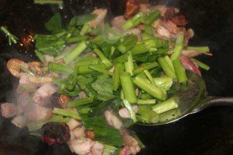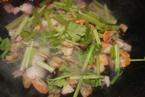 7. 再把浸泡好的干贝、虾仁、蛏干、芹菜杆放进去煸香