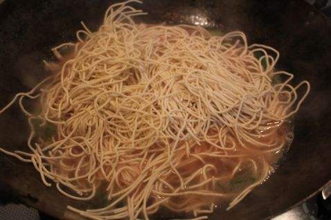 12. 再把面条均匀的洒在上面 先别用勺子弄她 待水开后再摊开