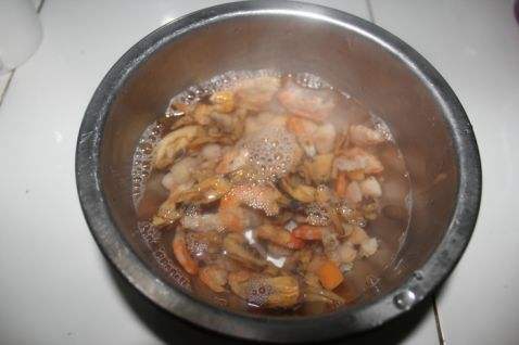 海鲜卤面的做法 1. 先把适量的干贝、蛏干、虾仁用水洗净 后用开水浸泡3分钟