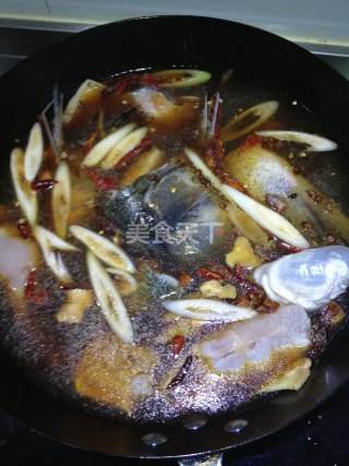 7 加入的水量以与鱼持平即为合适,后依次放入一瓶盖二锅头、一大勺老抽、剩余的葱、姜、花椒、大料、干红辣椒丝,蒜先团哑不要放,后加入三勺盐。