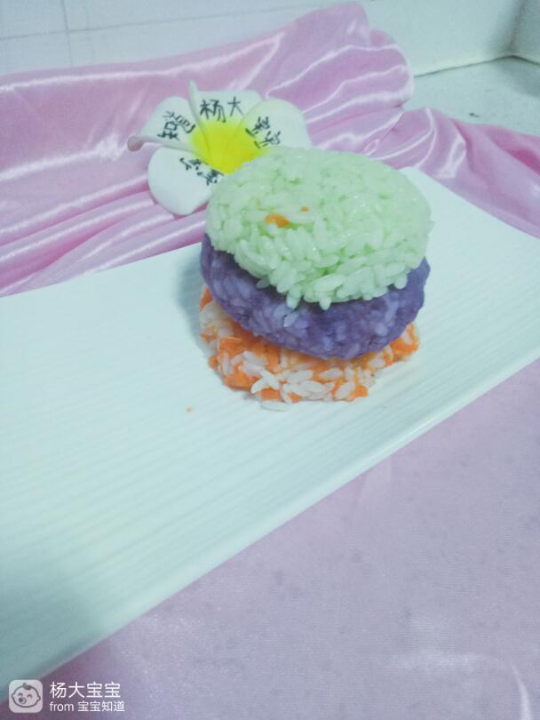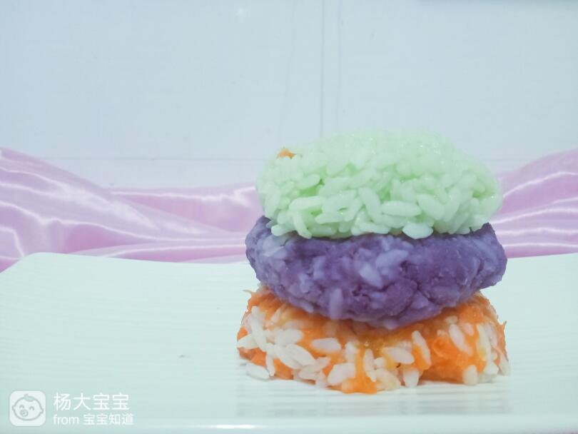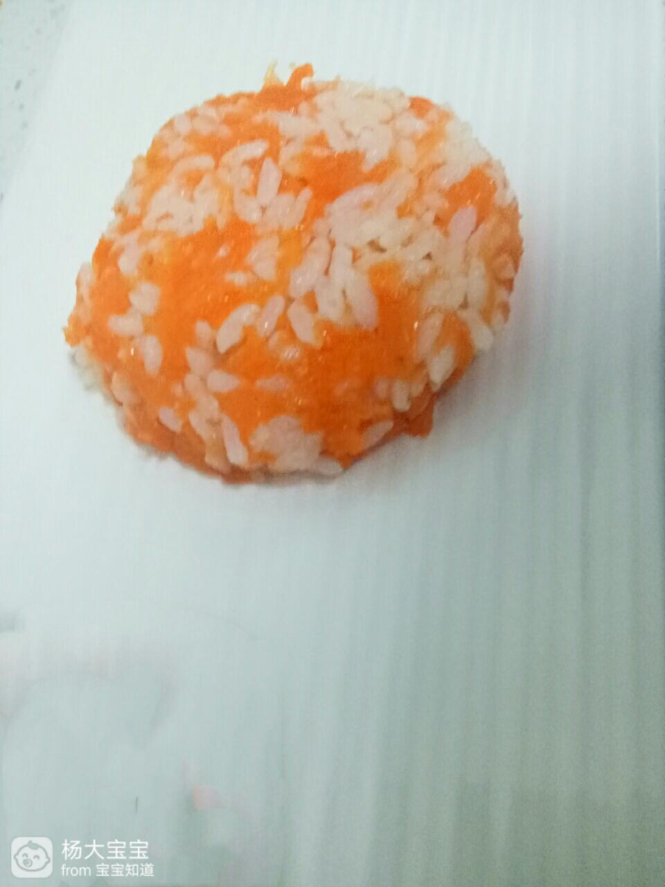 先弄紫薯加入米饭,混合均匀,然后胡萝卜在加入米饭用干净的小手抓均匀。