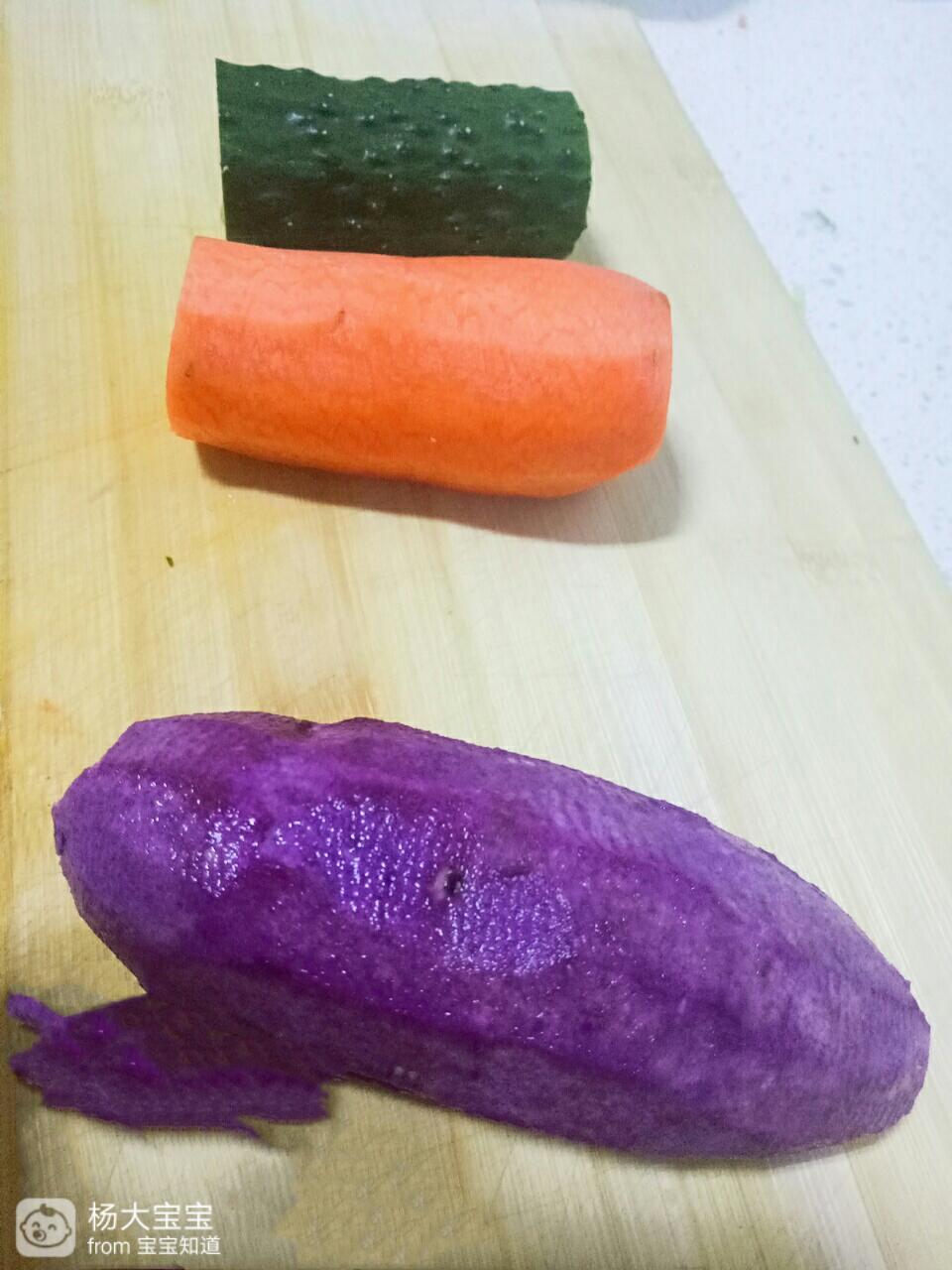 食材准备: 米饭、黄瓜一段、胡萝半蛋卜一段、紫薯一段