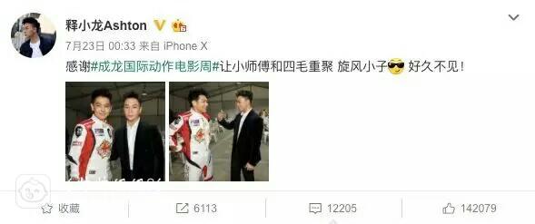 深夜,释小龙便在微博贴出两人的合影,并附文“小师傅和四毛重聚,旋风小子好久不见!”