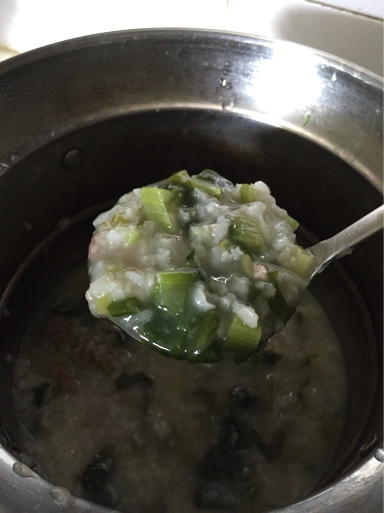 电饭锅里白粥提前已经煲好了,所以转入大锅后放入肉再依次放入青菜末,点开煤气大火煮沸后关火再放入葱就可以吃啦
