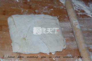 5 把面皮切四刀,一层层地叠好。