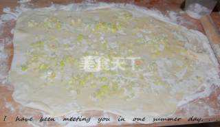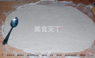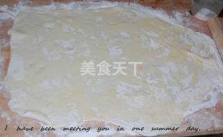 1 将面粉和成软面。在面板上洒上干面后,将面团擀薄。