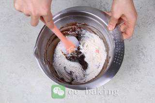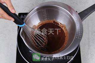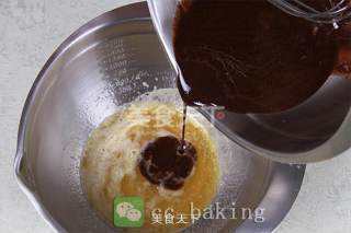 5 把巧克力夕缘黄油液倒进蛋黄的盆里。